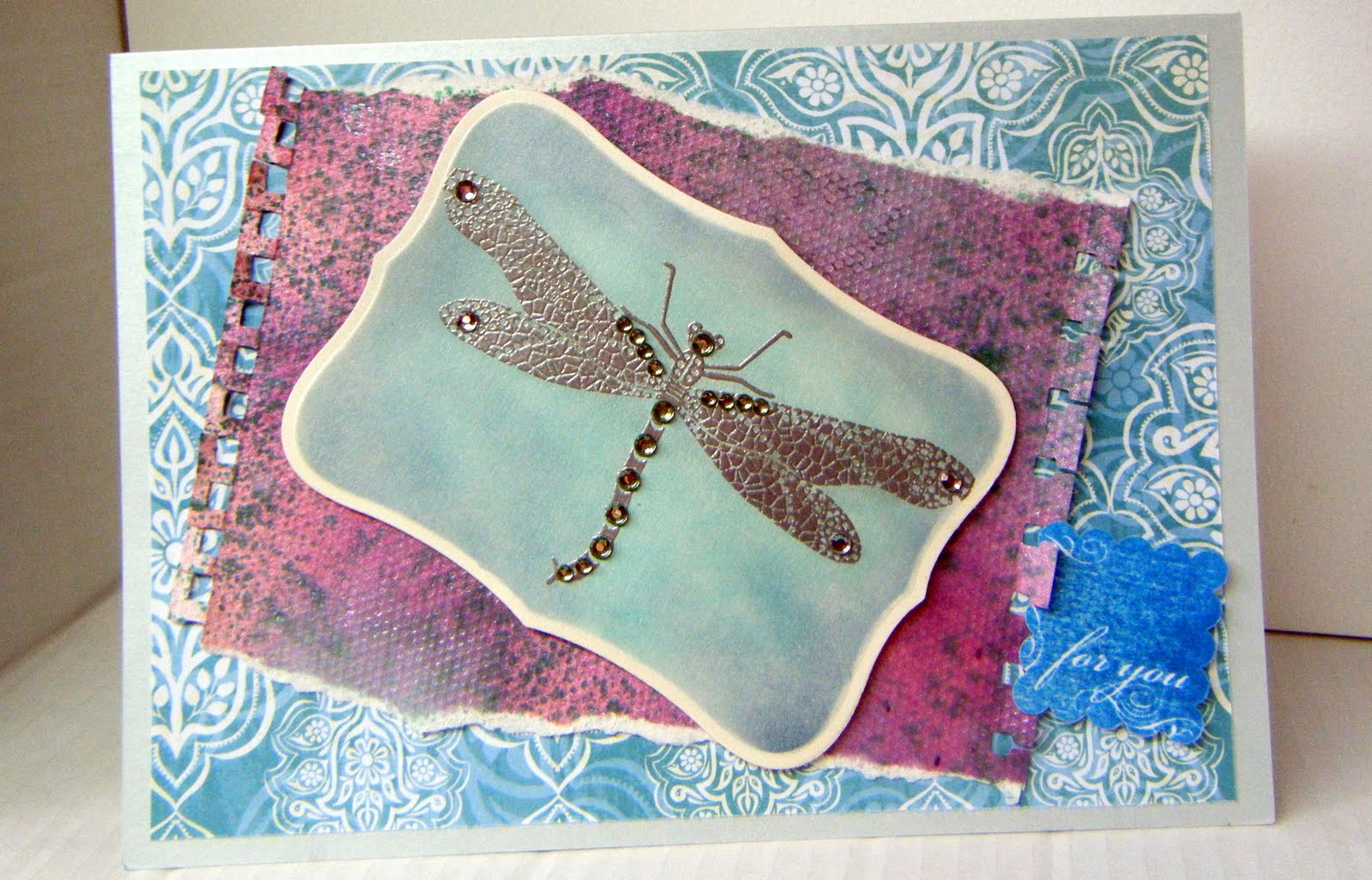 The dragonfly image (Joanna Sheen) is embossed in silver and embellished with varying sizes of gems. I have sponged several shades of blue around the image and mounted this onto a piece of toning watercolour paper spritzed with glimmer mists.